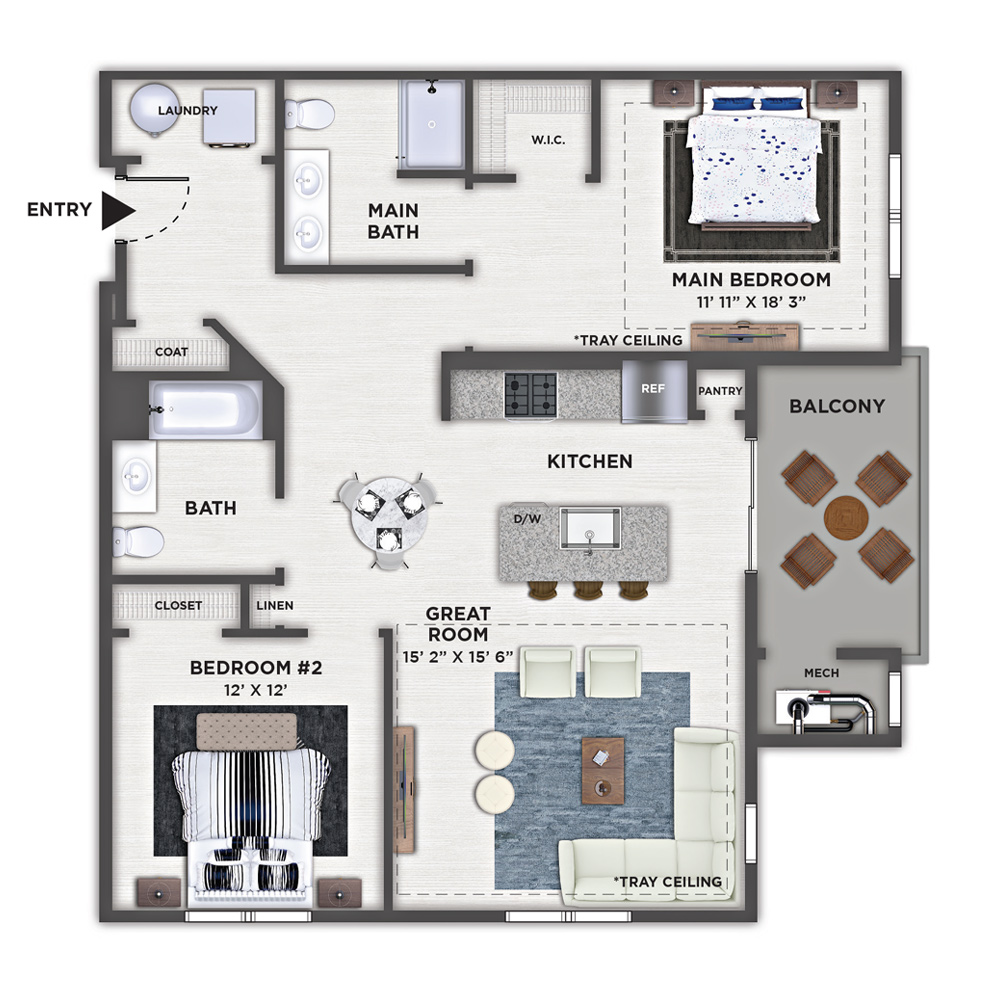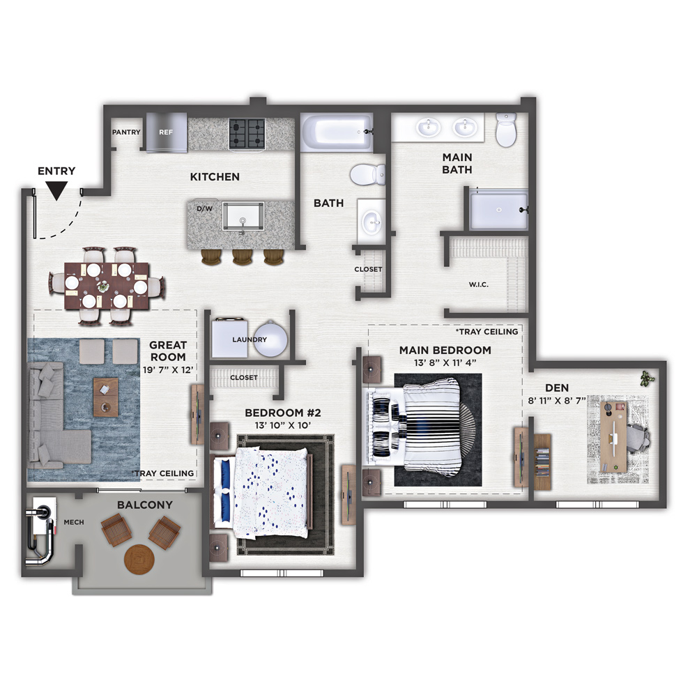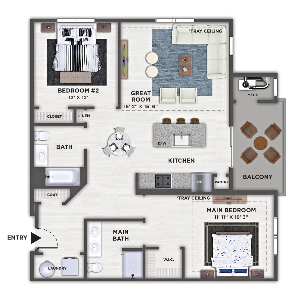 Floor plan details vary from residence and are not necessarily built exactly as indicated in this rendering. Continuing a policy of research and development, Presidential Gardens at Manchester, LLC must reserve the right to make modifications in design, terms, and products without notice or obligations. The design and documents of Presidential Gardens at Manchester are copyrighted. We have enforced and will continue to enforce our federal copyrights to protect our investment. Presidential Gardens at Manchester, LLC is not responsible for any errors and/or omissions. All sizes and square foot are approximate and for identification purposes only. Furniture is shown for illustrative purposes only.