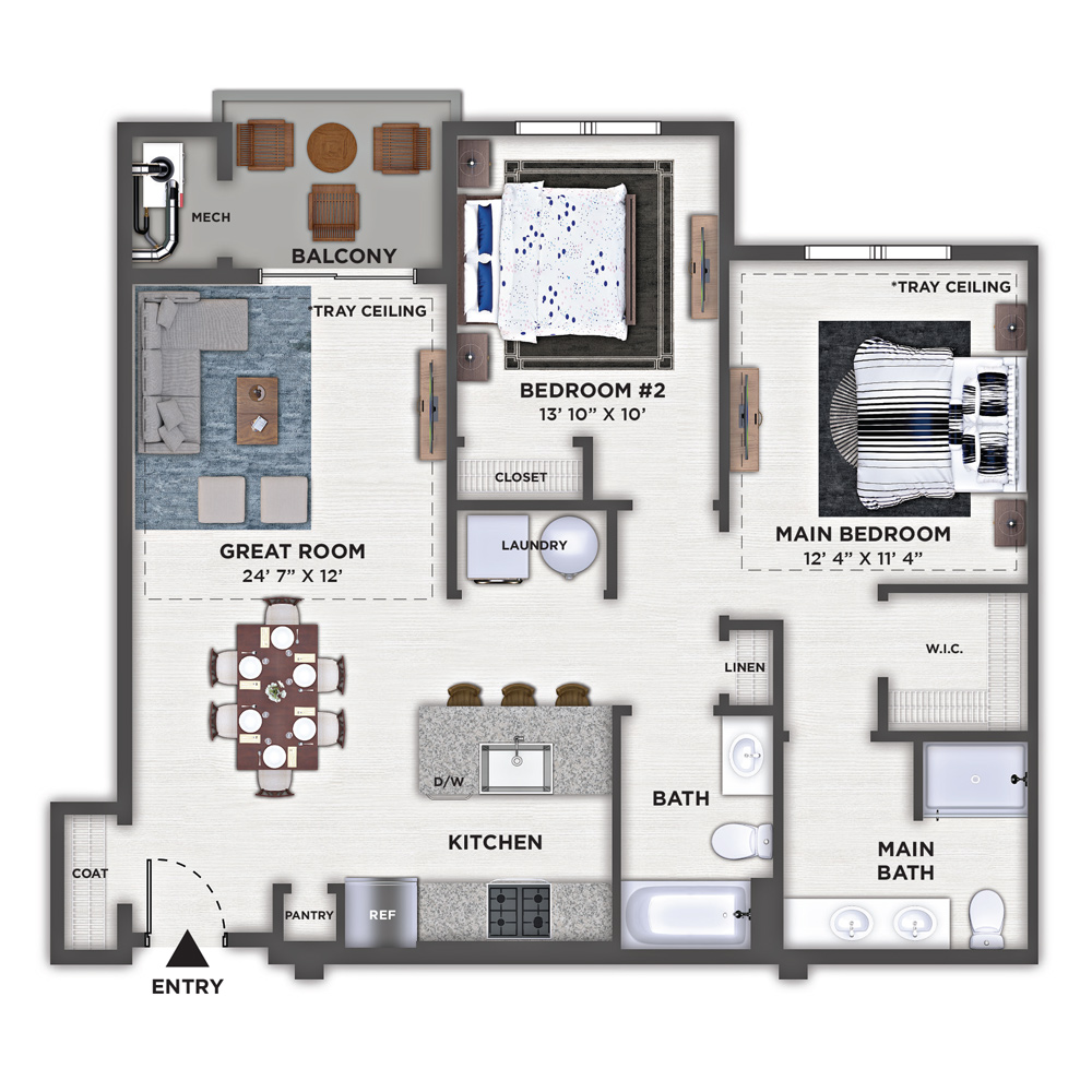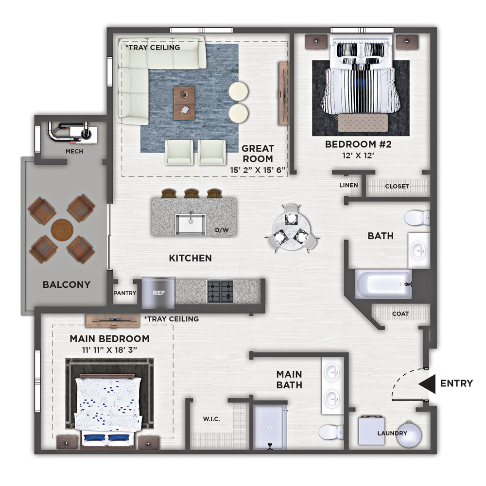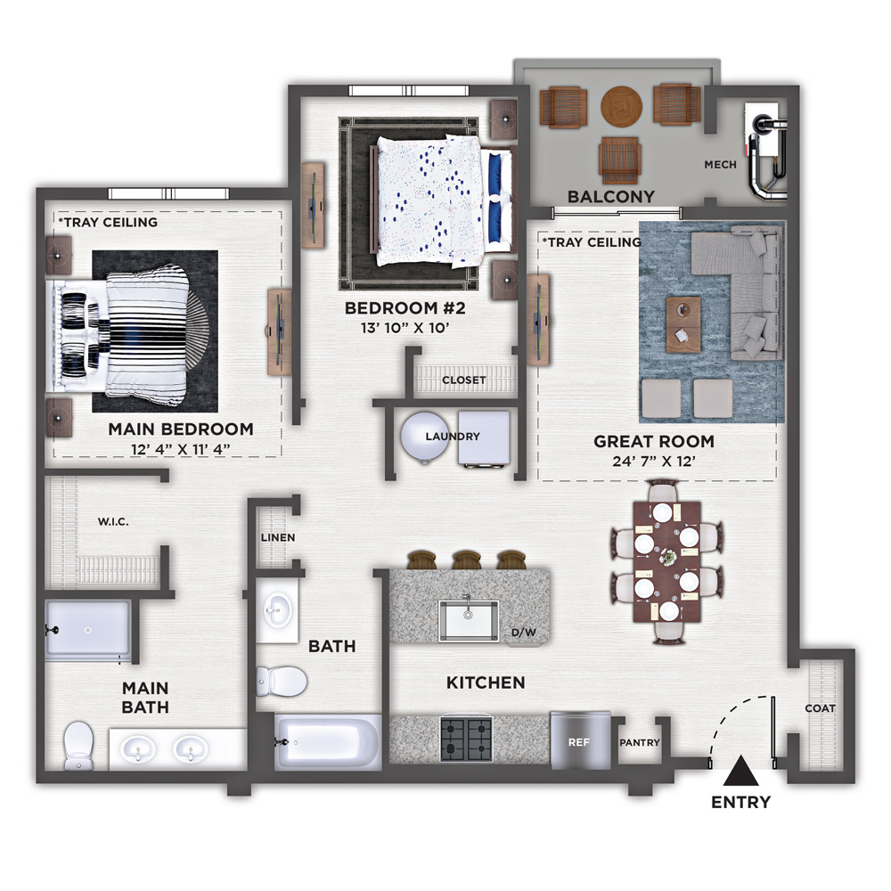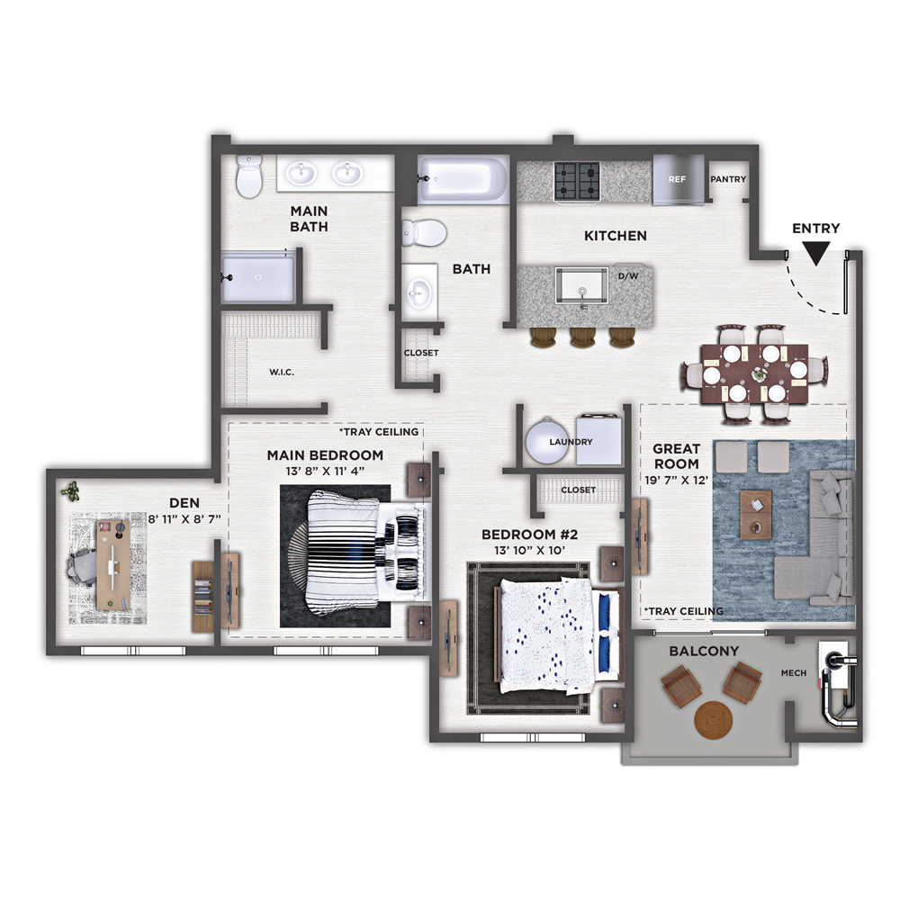 Floor plan details vary from residence and are not necessarily built exactly as indicated in this rendering. Continuing a policy of research and development, Presidential Gardens at Manchester, LLC must reserve the right to make modifications in design, terms, and products without notice or obligations. The design and documents of Presidential Gardens at Manchester are copyrighted. We have enforced and will continue to enforce our federal copyrights to protect our investment. Presidential Gardens at Manchester, LLC is not responsible for any errors and/or omissions. All sizes and square foot are approximate and for identification purposes only. Furniture is shown for illustrative purposes only.
